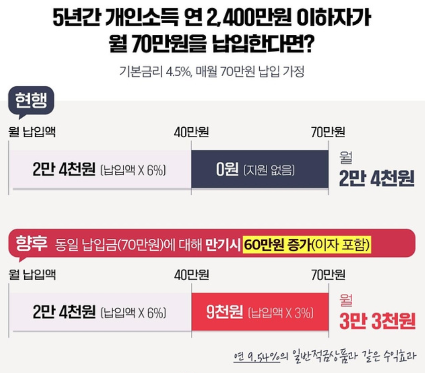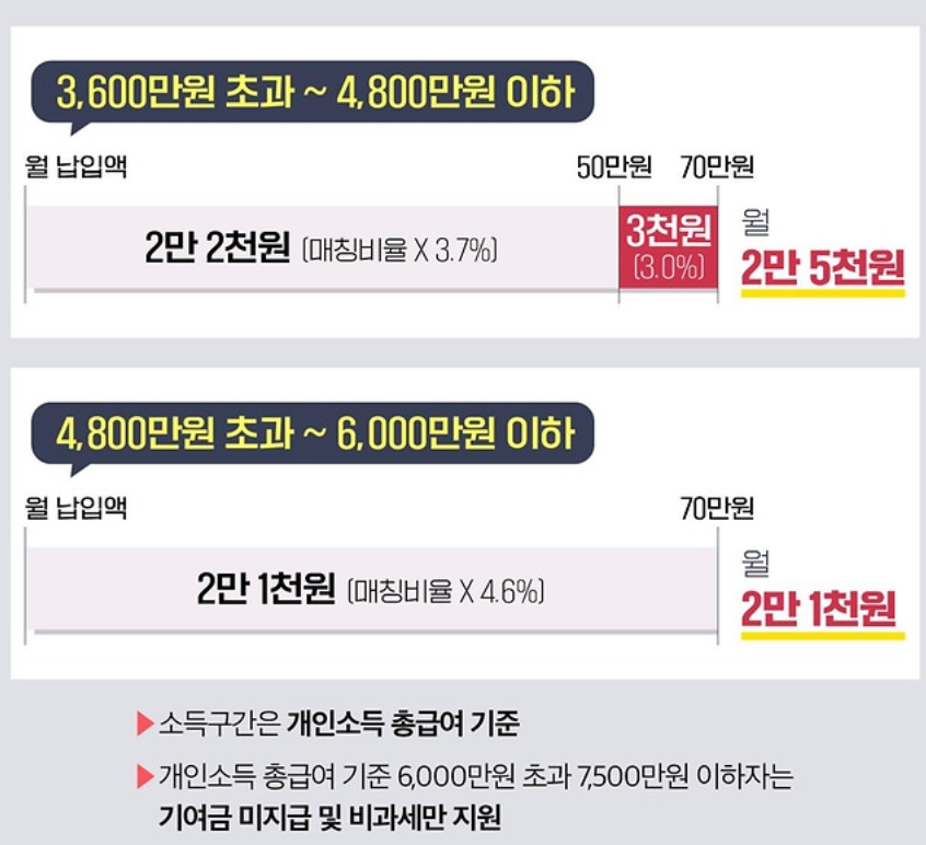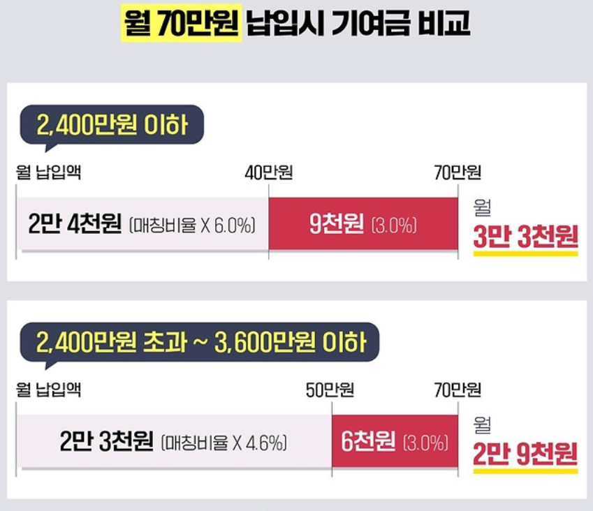 월 40/50/60 만원이었던 매칭한도가 70만원까지 확대되고, 확대된 매칭한도에 대해서 3.0%의 매칭비율로 지원금을 준다고 합니다.