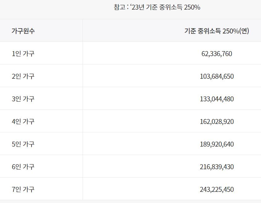 * 가구소득 : 가구원 수에 따른 기준 중위소득 250% 이하에 해당되어야 합니다.