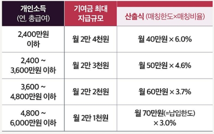 월 40/50/60 만원이었던 매칭한도가 70만원까지 확대되고, 확대된 매칭한도에 대해서 3.0%의 매칭비율로 지원금을 준다고 합니다.