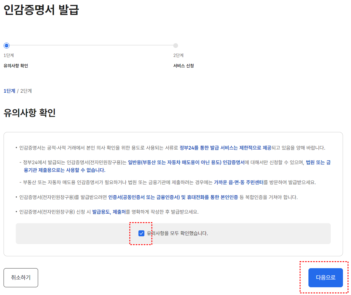 7. 유의사항 확인에 체크를 하시고 다음으로 버튼을 누릅니다.