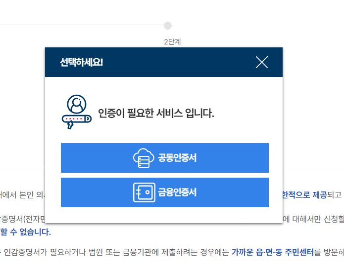 2. 본인인증: 두 번의 본인인증 절차가 있습니다. 첫번째는 공동인증서 또는 금융인증서를 통해 본인 인증을 진행합니다. 그러고 나서 휴대폰 본인인증을 한 번 더 하게 됩니다.