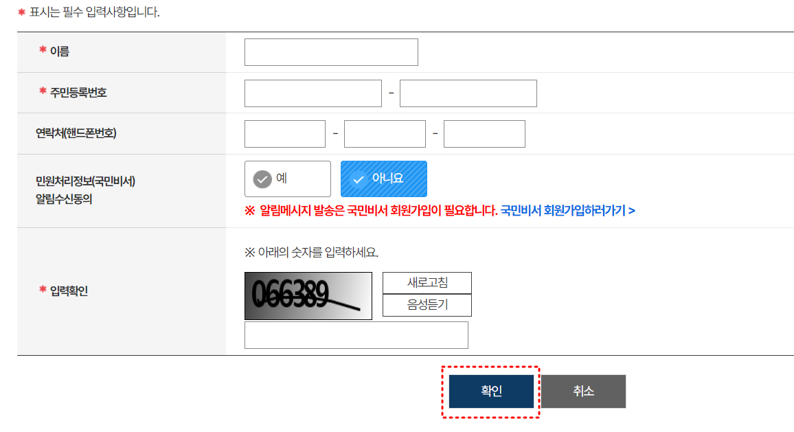 6. 신청 정보를 입력하시고 '확인'을 누릅니다.