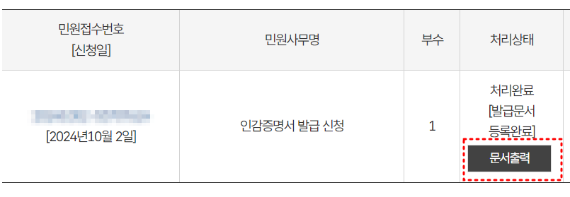 혹시 바로 출력하지 못하셨다면 정부24 홈페이지 첫화면에서 MYGOV → 나의 신청내역 → 서비스 신청내역 순서로 누르시면 문서출력을 할 수 있는 화면으로 갈 수 있습니다.