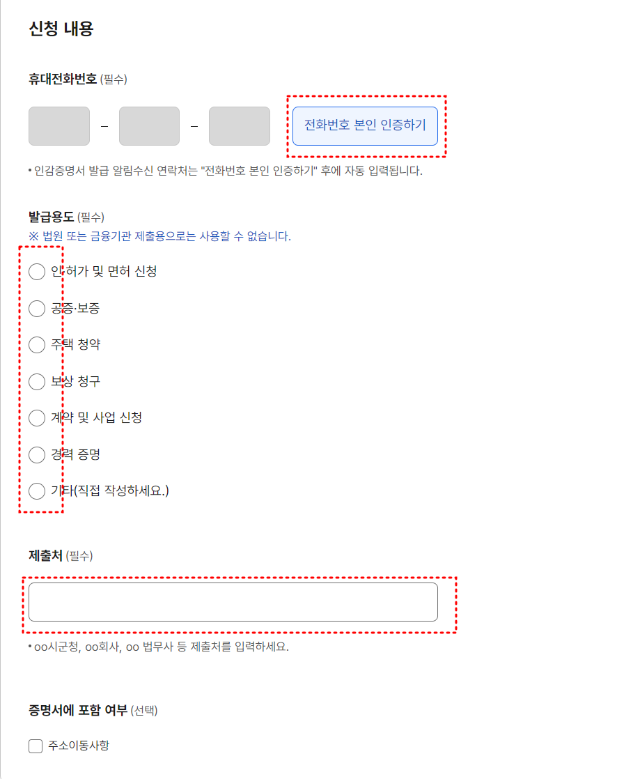 본인에게 해당되는 발급용도에 체크를 하고, 제출처를 입력합니다.