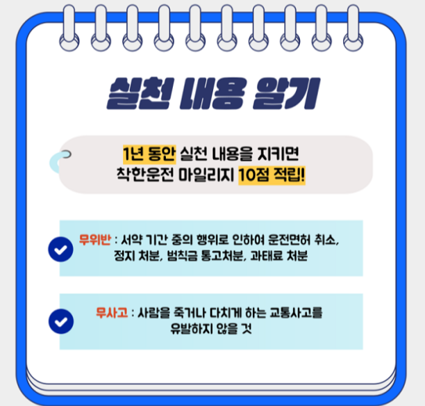 ● 무위반: 서약한 기간 동안 교통법규를 위반하지 않아야 합니다. 즉, 과태료, 범칙금, 면허 정지나 취소 처분을 받지 않아야 합니다.