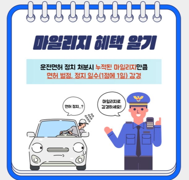 이 제도는 운전자가 1년 동안 교통사고나 법규 위반 없이 안전하게 운전할 경우 마일리지를 적립해주고, 누적된 마일리지만큼 면허 벌점이나 정지 일수를 감경받을 수 있는 혜택을 제공합니다.