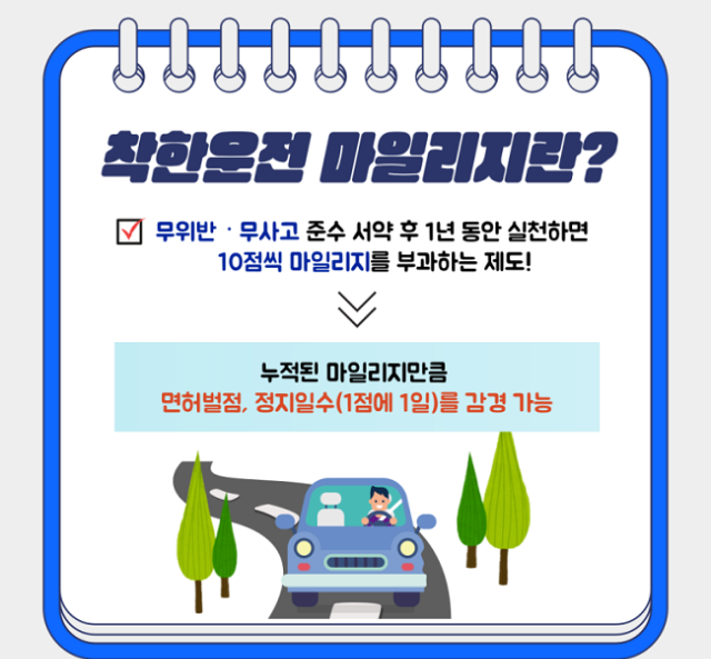 이 제도는 운전자가 1년 동안 교통사고나 법규 위반 없이 안전하게 운전할 경우 마일리지를 적립해주고, 누적된 마일리지만큼 면허 벌점이나 정지 일수를 감경받을 수 있는 혜택을 제공합니다.