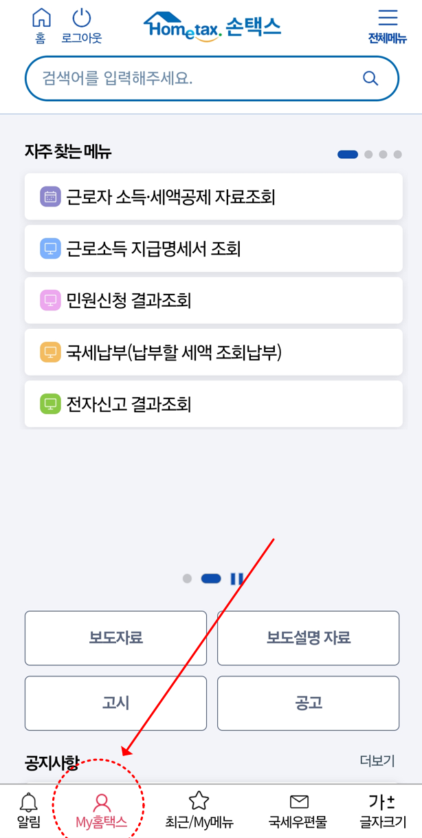1. 화면 맨 아래 "My홈택스" 선택