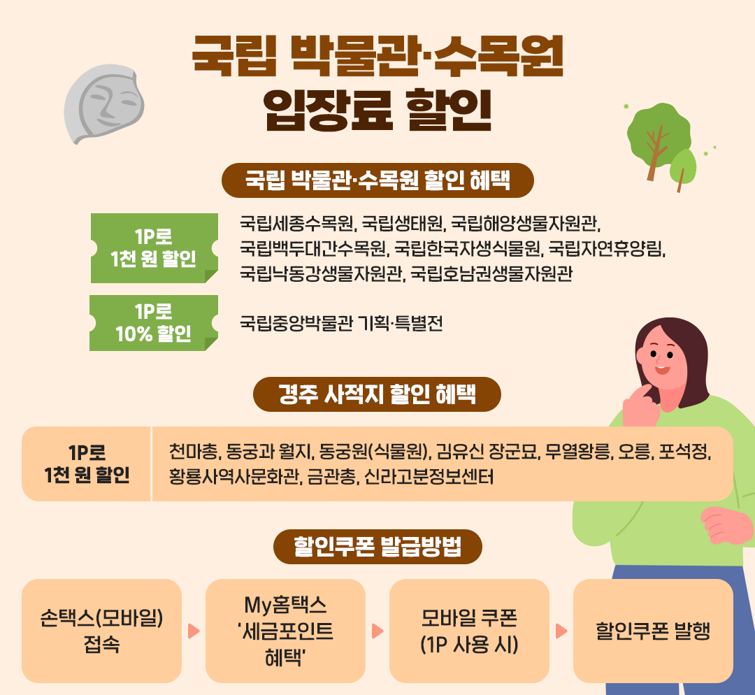 국립 박물관, 수목원, 그리고 경주 사적지에서도 세금포인트로 입장료 할인을 받을 수 있습니다.