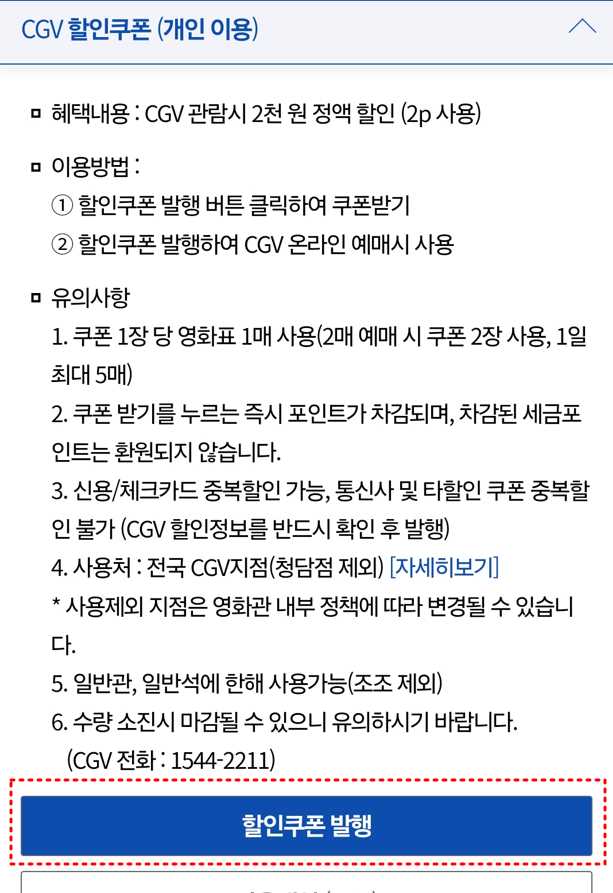이때 2포인트가 필요하고, 발급된 쿠폰번호를 CGV 앱에서 '내 쿠폰함'에 등록하면 바로 영화 예매 시 사용할 수 있답니다.