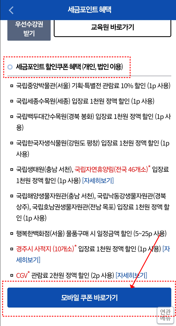 이번 글에서는 CGV 영화 할인부터 국립 박물관, 수목원 할인, 그리고 쇼핑 혜택까지 세금포인트로 할 수 있는 다양한 사용처를 쉽게 알려드릴게요.