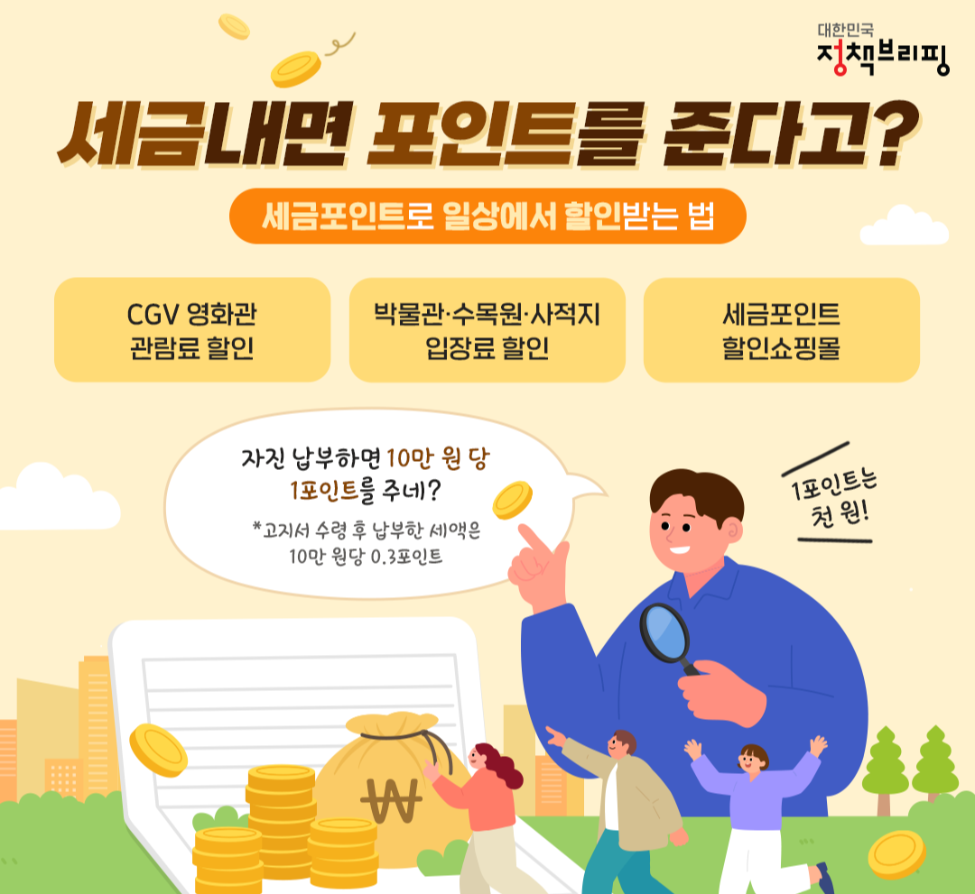 세금을 납부하면 그에 대한 보상으로 다양한 혜택을 받을 수 있는 세금포인트 제도! 이 포인트는 영화 할인, 박물관 입장료 할인, 쇼핑 할인 등 일상생활에서 여러 가지로 유용하게 사용할 수 있습니다. 납부한 세금이 헛되지 않게, 세금포인트를 적극적으로 활용해보세요.
