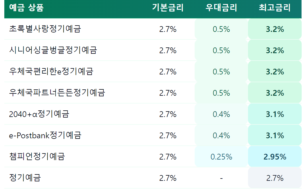 일반 은행의 예금 상품은 5천만원까지만 예금자보호가 되는 것에 반해, 우체금 예금은 나라가 전액 지급 보장을 해준다는 장점이 있죠.