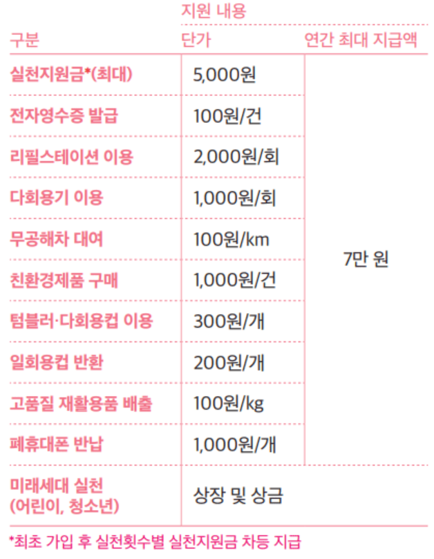 친환경 실천 활동을 통해 얻은 포인트는 참여자가 선택한 지급수단에 따라 현금, 포인트, 모바일 페이로 지급됩니다. 연간 최대 7만 원까지 적립할 수 있으며, 포인트는 다음달 말일까지 지급됩니다.