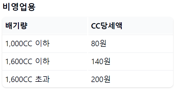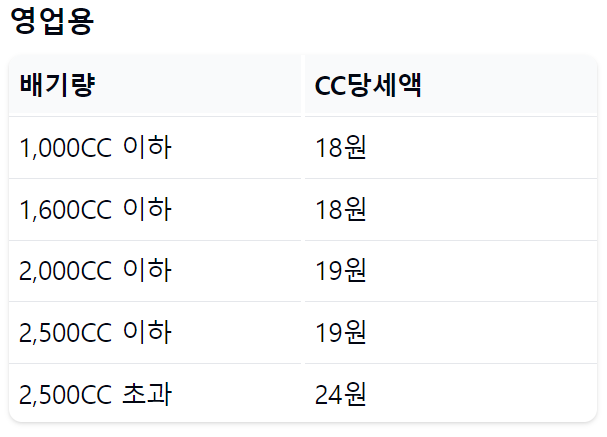 CC당 세액은 영업용과 비영업용 승용차의 세액이 서로 다른데요, 다음표를 참조하시기 바랍니다.