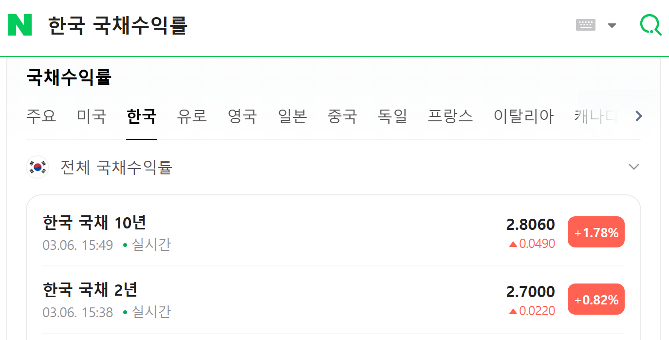 좀 더 간단하게는 검색창에서 국채 금리를 검색해서 비교해보는 방법으로 확인해 볼 수도 있습니다.