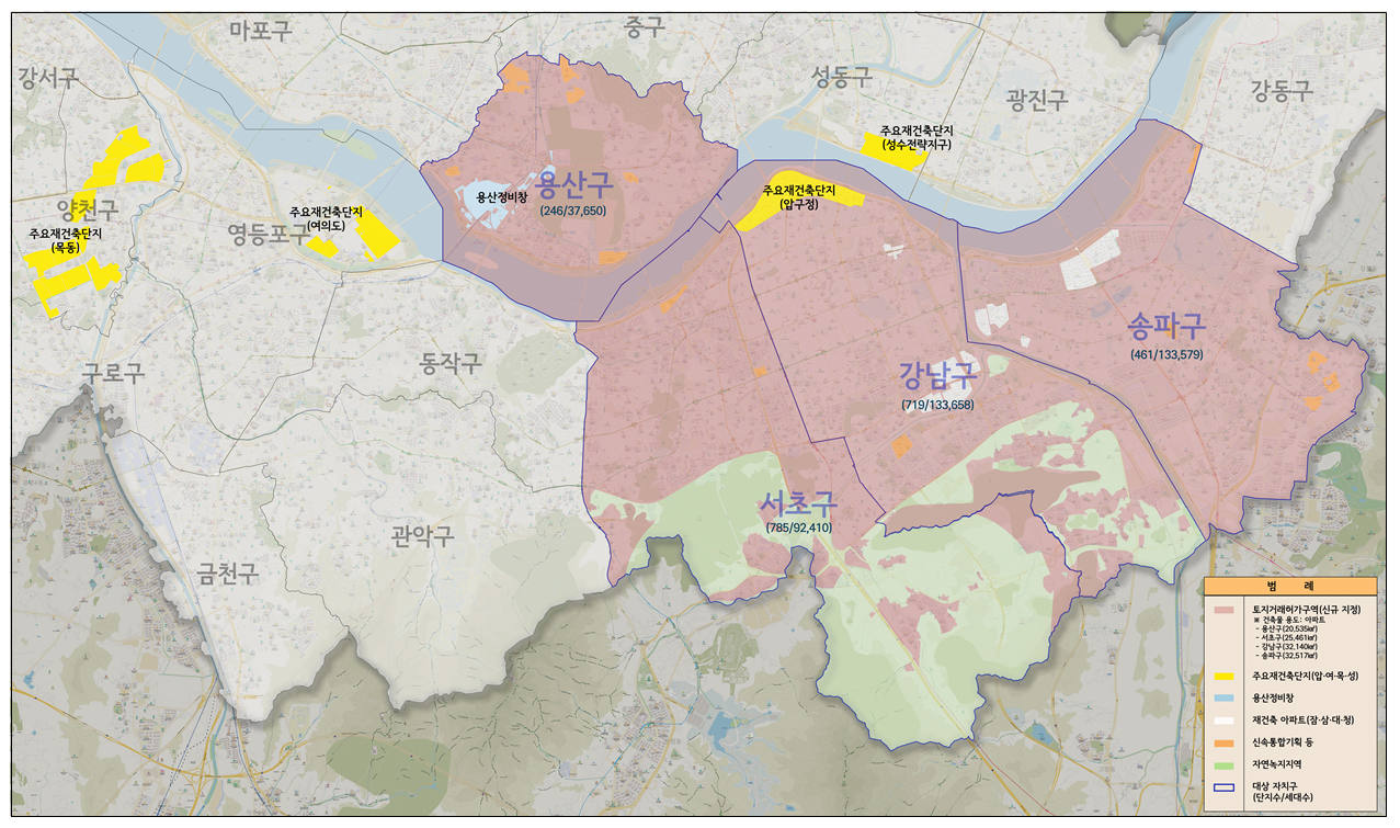 2025년 3월 19일, 서울시와 국토교통부는 강남구, 서초구, 송파구, 용산구의 전체 아파트 단지를 토지거래허가구역으로 재지정한다고 발표했습니다.