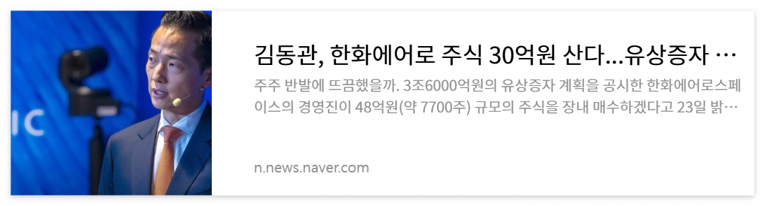 김동관 한화 부회장이 한화에어로스페이스 주식 30억원을 매수한다는 소식이 전해졌습니다.