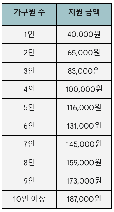 4인 가구 기준으로 한 달에 10만원의 지원금을 바우처로 받을 수 있습니다.