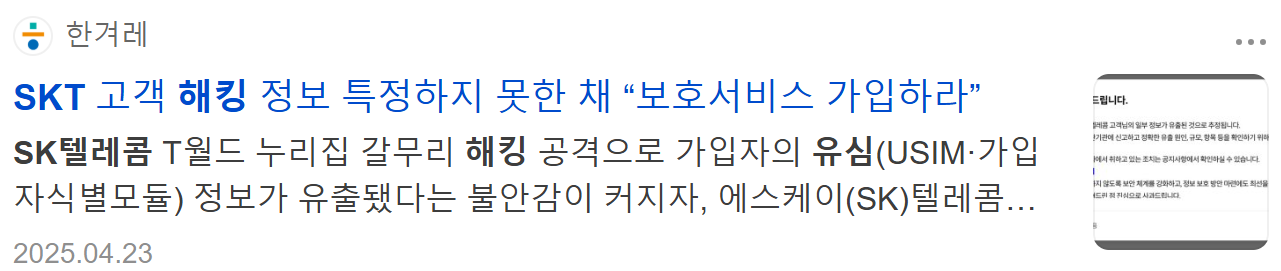| SKT 유심 해킹 사건 정리 및 유심 무료 교체 방법 안내 (0) | 2025.04.25 |