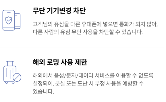 ▪ 유심보호서비스 가입 시 해외 로밍이 되지 않습니다. 로밍 요금제에 가입한 경우 로밍 요금제를 먼저 해지하고 유심보호서비스에 가입해야 합니다.