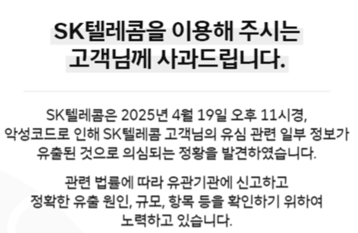 2025년 4월, SKT 통신망에서 고객들의 유심 관련 정보가 외부에 유출된 사실이 확인되었습니다.