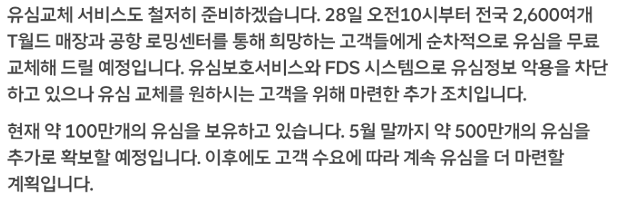 따라서 SKT 이용자들의 유심 보호와 교체가 필요한 상황입니다.