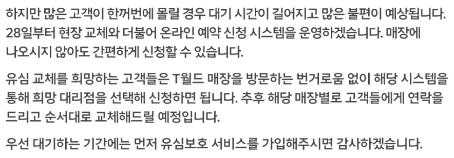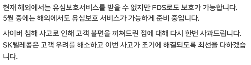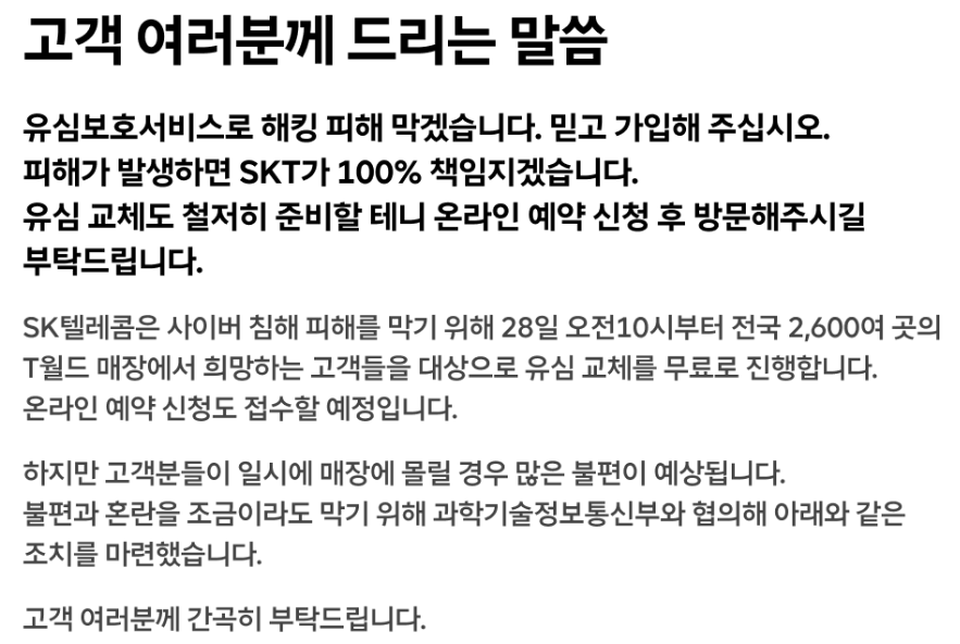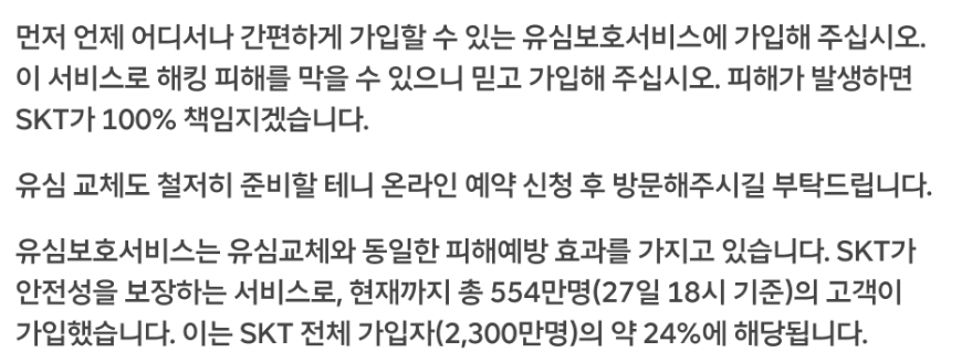 이 발표문을 보면 유심보호서비스는 반드시 가입해야 될 것으로 보입니다. '향후 유심보호서비스 가입자'에 대한 유심 불법 복제 피해 사례가 발생할 경우 SKT가 책임지고 보상하겠다는 말은 유심보호서비스에 가입하지 않았을 경우에는 책임지지 않을 수도 있다는 말로도 해석될 여지가 있기 때문에 유심보호서비스는 꼭 가입하시기 바랍니다.